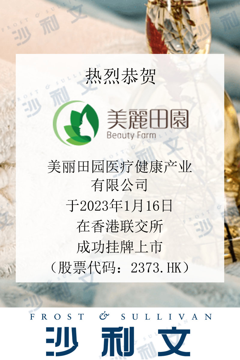 美丽田园医疗健康产业有限公司(股票代码:2373.HK)于2023年1月16日成功登陆香港资本市场主板。公司是中国美丽与健康管理服务领域的龙头企业,是中国最大的传统美容服务提供商和第四大的非外科手术类医疗美容服务提供商,旗下包括美丽田园、贝黎诗、研源及秀可儿等四个连锁品牌,多元化服务涵盖传统美容服务、医疗美容服务、以及亚健康评估及干预服务,建立了广泛的门店网络及庞大的忠诚客户群。弗若斯特沙利文(Frost & Sullivan,以下简称“沙利文”)为美丽田园医疗健康产业有限公司上市提供独家行业顾问服务,特此热烈祝贺其成功上市。