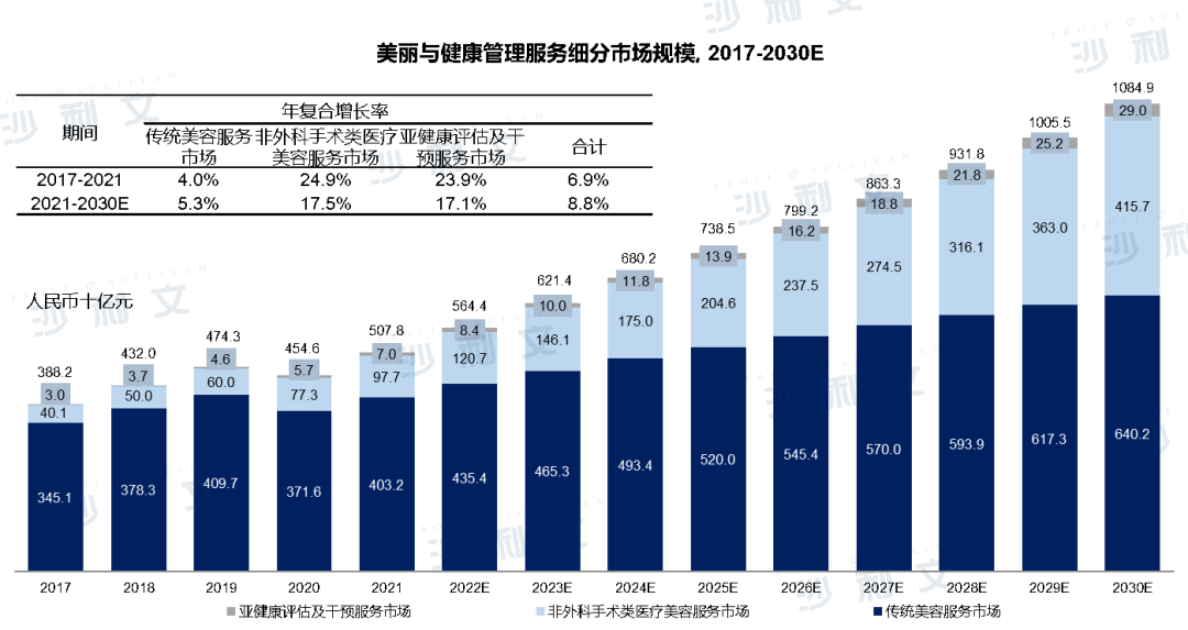 传统美容服务包括身体护理服务及面部服务。身体护理服务主要包括纤体及身体养护服务。面部服务主要包括清洁及保湿、皮肤美白及皮肤年轻化服务。根据沙利文报告,中国传统美容服务市场的总收益由2017年的人民币3,451亿元增长至2021年的人民币4,032亿元,年复合增长率为4.0%。随着消费升级,传统美容服务市场将继续增长,预计市场规模将在2030年达人民币6,402亿元,2021年至2030年的年复合增长率为5.3%。