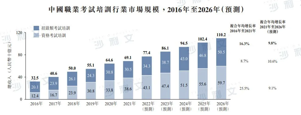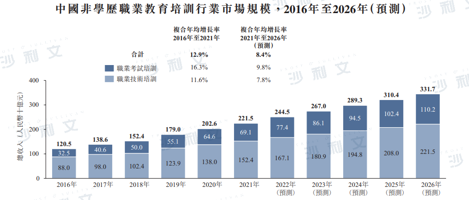 随着高等教育机构就学人数与日俱增,以及中国就业市场对具备必要认证和资格的专业人员需求不断上升,促使越来越多即将毕业的大学生和年青的专业人士通过职业考试培训服务提高竞争力和就业机会,因此职业考试培训行业较整个非学历职业教育培训行业增长更快。根据沙利文报告,中国的非学历职业教育培训行业的市场规模以收入计算从2016年的人民币1,205亿元增至2021年的人民币2,215亿元,复合年均增长率为12.9%,预期截至2026年会达到人民币3,317亿元,2021年至2026年的复合年均增长率为8.4%。