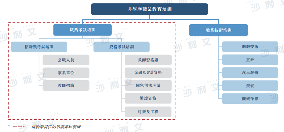 中国的非学历职业教育培训包括(1)职业考试培训,目标学员是打算通过招录类考试投身公共职务及事业单位或不同专业或行业的求职者,或希望通过资格考试取得专业证书者;及(2)职业技术培训,目标学员是希望在特定范畴获得一技之长者。