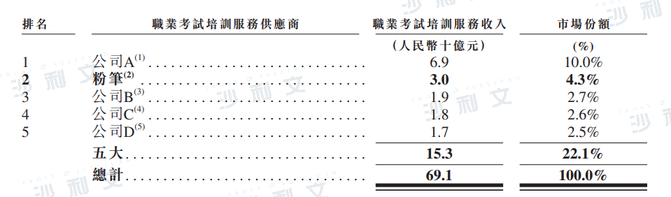 2021年按收入计的中国职业考试培训行业五大市场参与者总市场份额为22.1%。2021年公司以4.3%的市场份额排名第二。