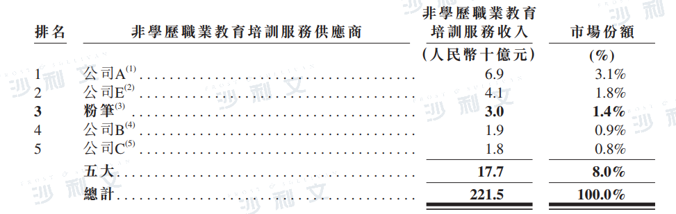中国非学历职业教育培训行业相对分散,2021年按收入计的五大市场参与者总市场份额为8.0%。2021年粉笔以1.4%的市场份额排名第三。
