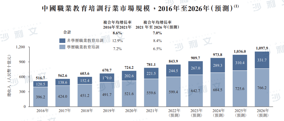 根据沙利文报告,中国的职业教育培训行业的市场规模以收入计算从2016年的人民币5,167亿元增至2021年的人民币7,811亿元,复合年均增长率为8.6%,预期截至2026年会达到人民币10,979亿元,2021年至2026年的复合年均增长率为7.0%。
