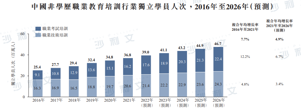 根据沙利文报告,中国非学历职业教育培训行业的独立学员人次由2016年的25.4百万名增至2021年的36.8百万名,复合年均增长率为7.7%,预期截至2026年会达到46.7百万名,2021年至2026年的复合年均增长率为4.9%。