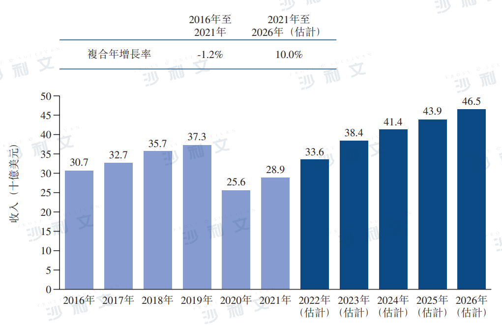 过往,国际餐饮服务市场经历了快速增长,从2016年的28,991亿美元增长到2019年的33,632亿美元。由于新冠肺炎疫情,国际餐饮服务市场在2020年经历了暂时性下降,并随著新冠肺炎疫情逐渐得到控制在2021年开始恢复至26,440亿美元。随著越来越多的国家解除限制,预计国际餐饮服务市场将继续稳定增长,于2026年将达到37,771亿美元,2021年至2026年的复合年增长率为7.4%。