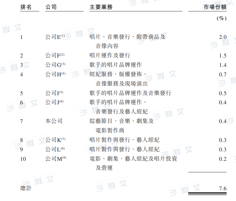 根据沙利文报告,中国音乐市场高度分散,按2021年的收入计,前十大市场参与者的市场份额为7.6%,其中,星空华文排名第七,市场份额约为0.4%。