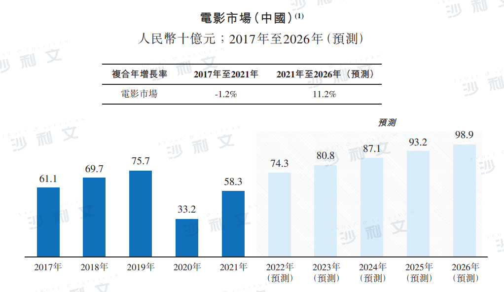 由于COVID-19疫情,尤其是暂时关闭电影院等社交隔离措施,2020年电影市场急剧下滑,市场规模为人民币332亿元。由于收入水平不断上升的累积影响,娱乐消费需求持续增长,预计至2026年,院线电影市场的规模将达到人民币989亿元,2021年至2026年期间的复合年增长率为11.2%。