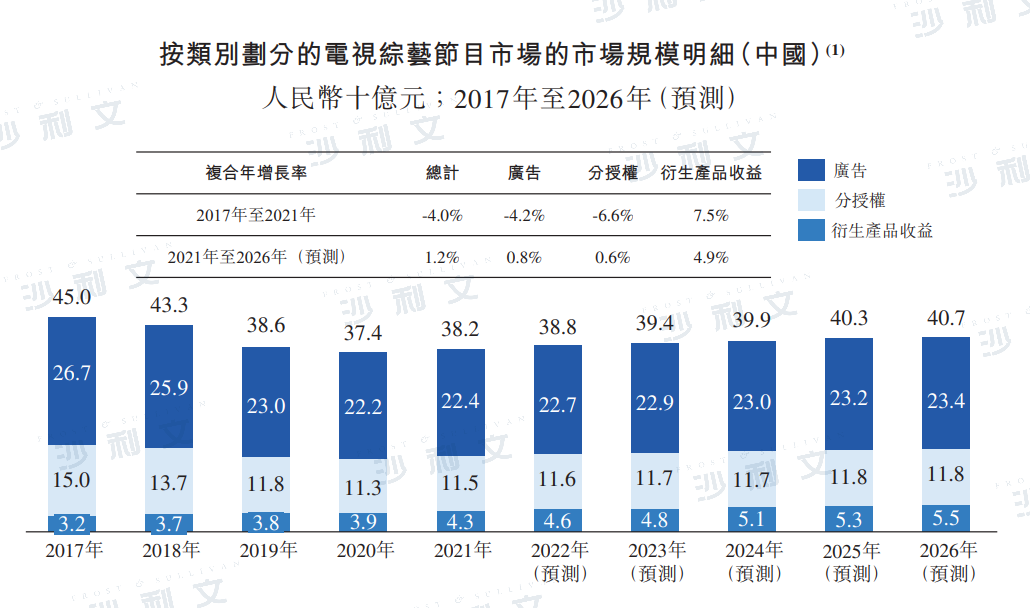 电视综艺节目的收入主要来自于广告、分授权及衍生产品。于2017年至2019年期间,中国电视综艺节目市场的市场规模由约人民币450亿元略微减少至约人民币386亿元,主要由于受网络综艺节目热度及竞争程度影响,电视广告减少及播出的电视综艺节目数量不断减少;以及主要受娱乐行业法规政策的发展及平台控制成本的趋势影响,分授权收入减少。