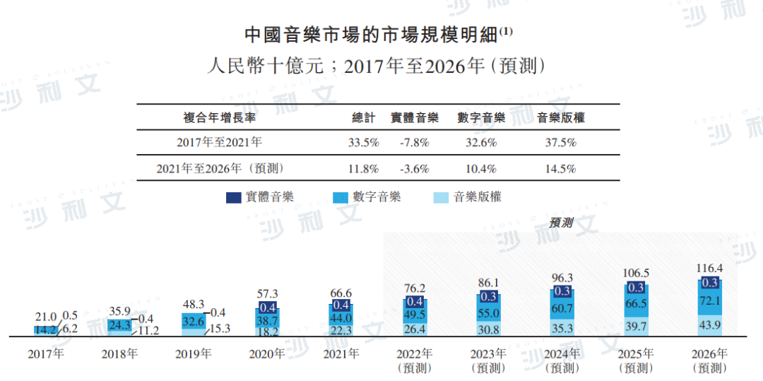 音乐市场的总市场规模由2017年的人民币210亿元增至2021年的人民币666亿元,复合年增长率为33.5%,且预计于2026年将进一步增加至人民币1,164亿元,复合年增长率为11.8%。