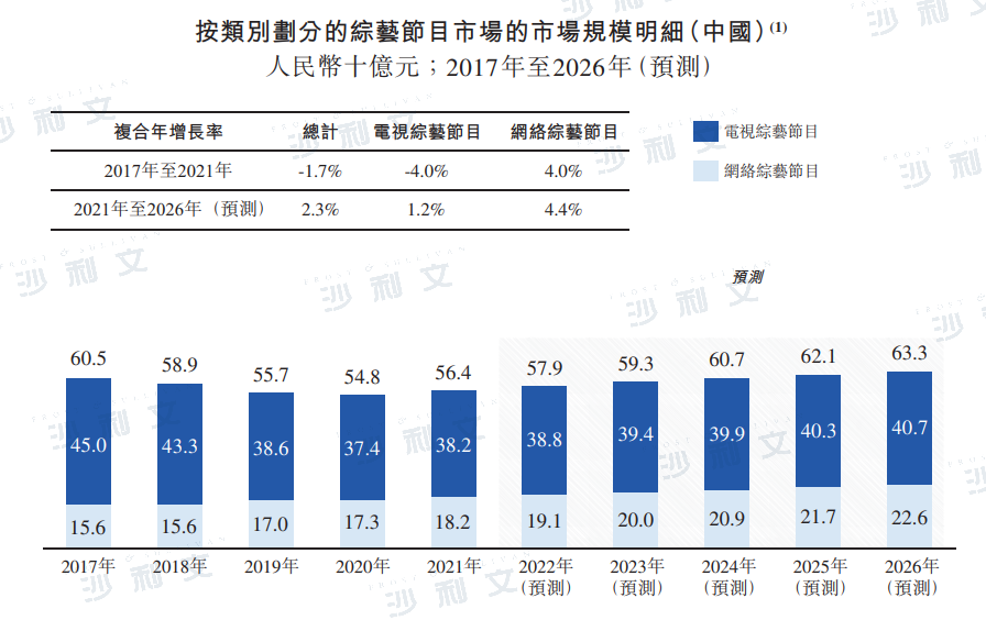 因此,预计电视综艺节目市场将保持稳定,2021年至2026年期间的复合年增长率约为1.2%,至2026年将达至约人民币407亿元,预期网络综艺节目市场于2026年将增加至人民币226亿元,2021年至2026年期间的复合年增长率为4.4%。