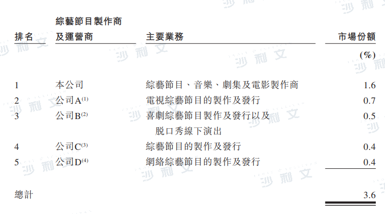 根据沙利文报告,按广告、分授权及衍生产品产生的收入计算,中国综艺节目市场(不包括专用广播频道)前五大参与者的总体市场份额约为3.6%,其中,星空华文排名第一,市场份额约为1.6%。