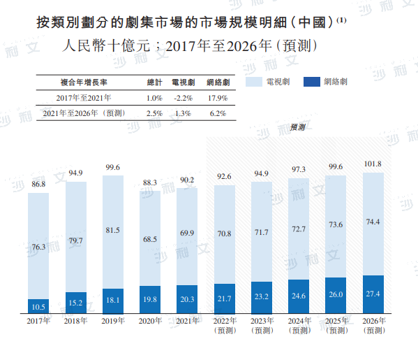 剧集市场的市场规模(以授权收入和广告收入计量)于2017年至2021年期间出现波动,于2021年达到人民币902亿元,该市场规模预计会适度增长并于2026年达到人民币1,018亿元,2021年至2026年期间的复合年增长率为2.5%。