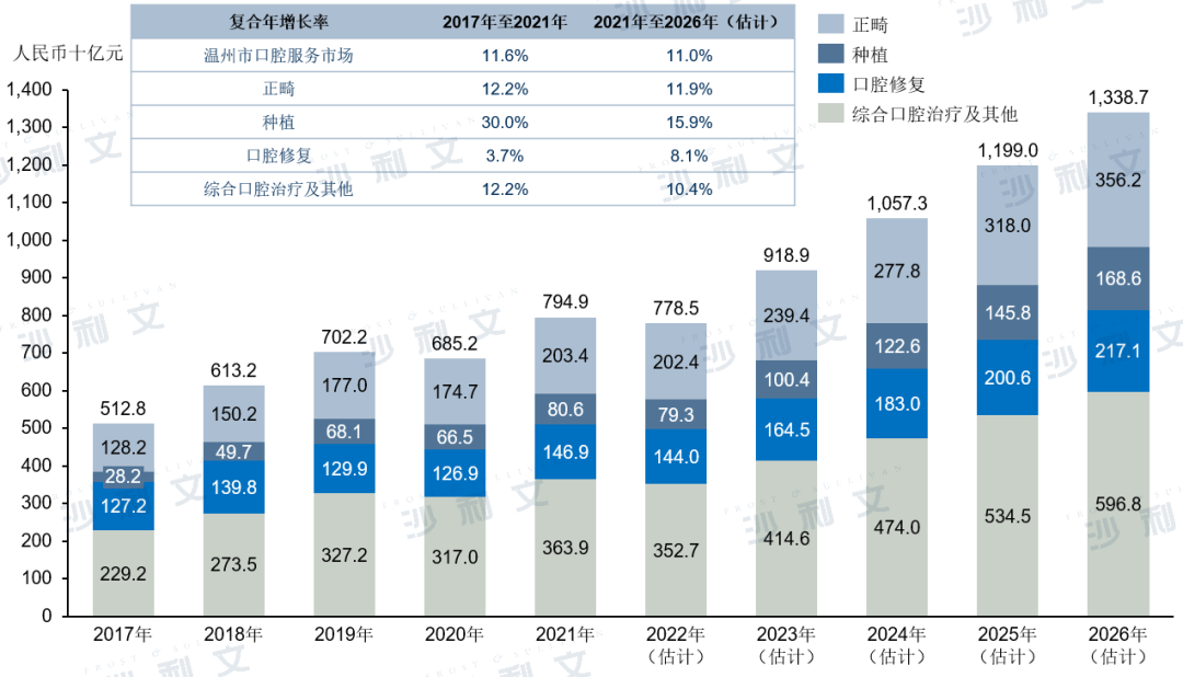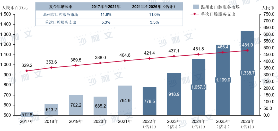 按照这样的趋势,我们预测在经历2022的疫情之后,在温州市经济持续稳定发展的加持下,预计未来温州市口腔服务市场整体规模将在2026年达到约人民币1,338.7百万元,2021年至2026年期间的复合年增长率为11.0%。