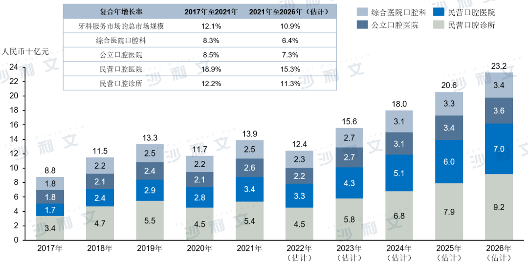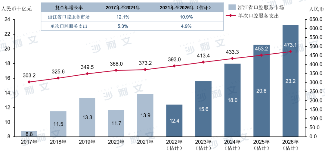 根据沙利文报告,在浙江省内,自2017年至2021年,民营口腔医院及民营口腔诊所的市场规模分别由约人民币17亿元及人民币34亿元增长至约人民币34亿元及人民币54亿元,期间内的复合年增长率分别为18.9%与12.2%。民营口腔服务提供商的主要引领着浙江省口腔服务市场的增长。