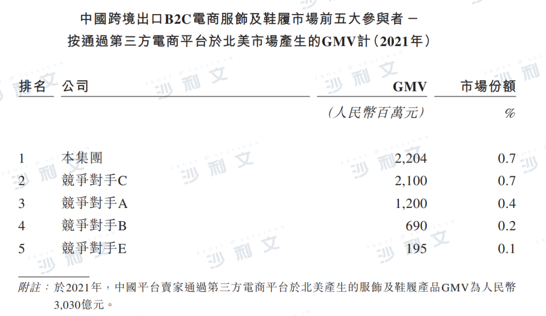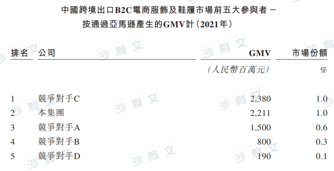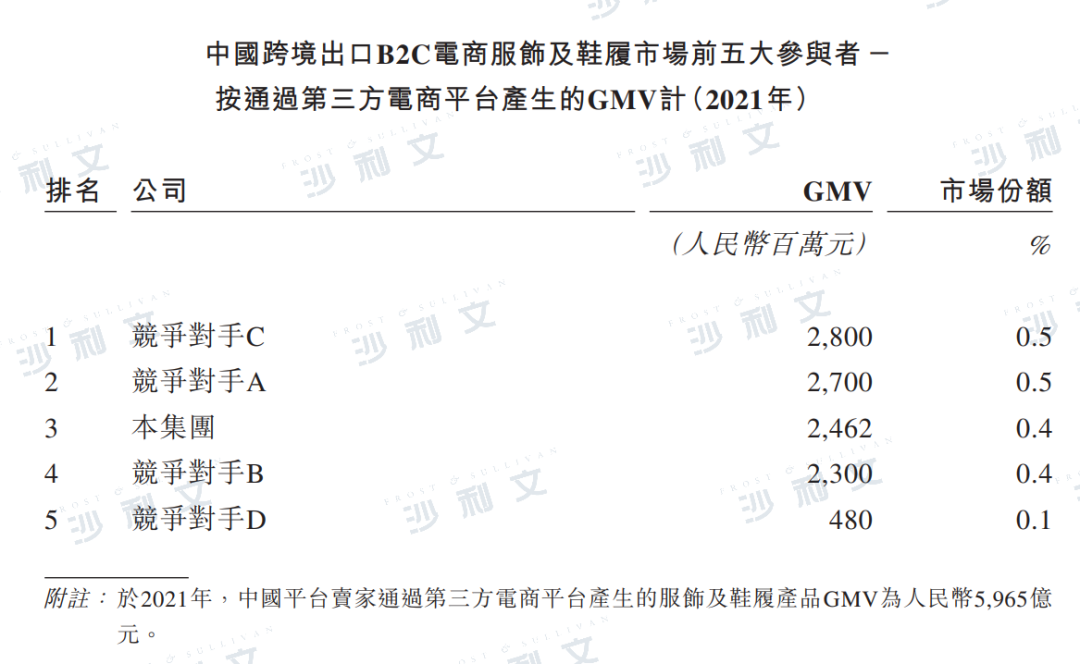 根据沙利文报告,按2021年通过第三方电商平台销售的服饰及鞋履产品的GMV计,子不语在中国跨境出口B2C电商服饰及鞋履市场的所有平台卖家当中排名第三,于人民币5,965亿元的市场中占据0.4%的市场份额。