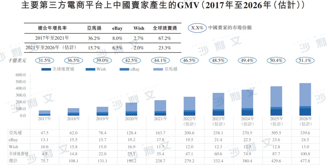 主要第三方跨境电商平台包括亚马逊、eBay、全球速卖通及Wish。根据沙利文报告,于2021年,按GMV计,这四个平台的市场份额合共约占全球所有电商平台的10.6%。这四个平台的第三方平台业务产生的GMV总额由2017年的2,401亿美元稳步增长至2021年的5,188亿美元,且预期于2026年达到9,352亿美元,2021年至2026年的复合年增长率为12.5%。