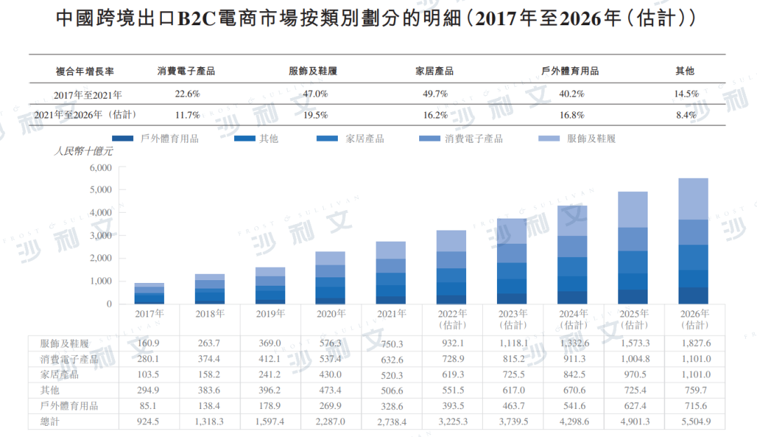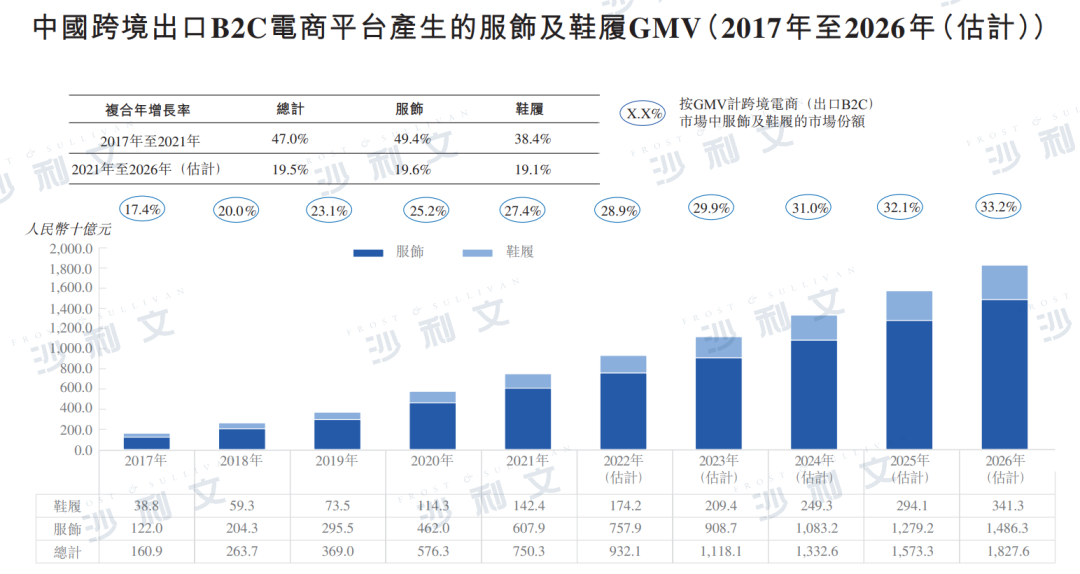 根据沙利文报告,在线上销售渠道发展和客户收入水平提高的推动下,服饰及鞋履在跨境出口B2C电商市场中的市场份额按GMV计算由2017年的17.4%稳步增长至2021年的27.4%,成为2021年中国跨境出口B2C电商市场的最大组成部分,预期将于2026年进一步增长至33.2%。