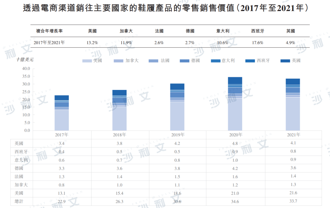 于2017年至2021年,通过电商渠道销往该等主要国家的鞋履产品的零售销售价值由229亿美元增加至337亿美元。根据沙利文报告,与服饰产品市场相似,在这些主要国家中,美国亦带来最高零售销售价值,其次为英国及德国。具体而言,通过电商渠道销往美国的鞋履产品的零售销售价值由2017年的131亿美元增加至2021年的216亿美元。