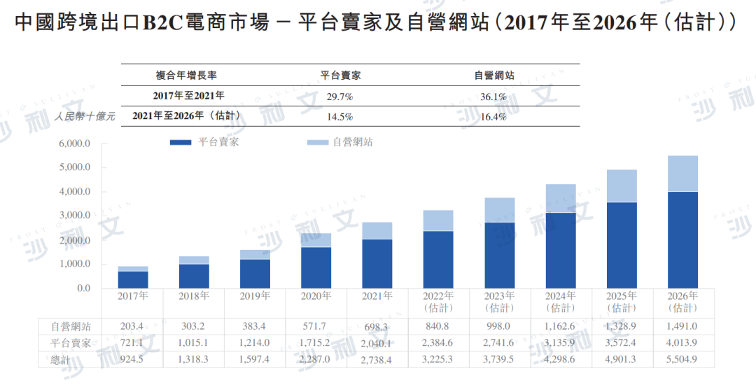根据沙利文报告,自营网站于中国跨境出口B2C电商市场所占市场规模由2017年的人民币2,034亿元增加至2021年的人民币6,983亿元,预计到2026年将进一步增加至人民币14,910亿元,2021年至2026年的复合年增长率为16.4%。