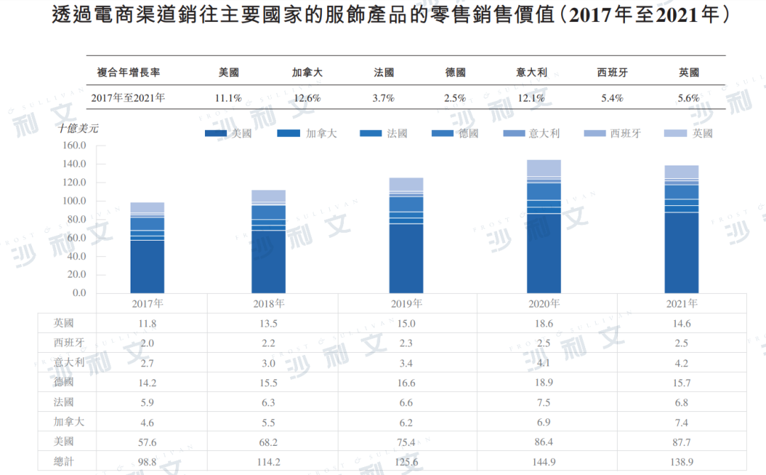 根据沙利文报告,于2017年至2021年,通过电商渠道销往该等主要国家的服饰产品的零售销售价值由988亿美元增加至1,389亿美元。在这些主要国家中,美国带来的零售销售价值最高,其次为德国及英国。具体而言,通过电商渠道销往美国的服饰产品的零售销售价值由2017年的576亿美元增加至2021年的877亿美元。