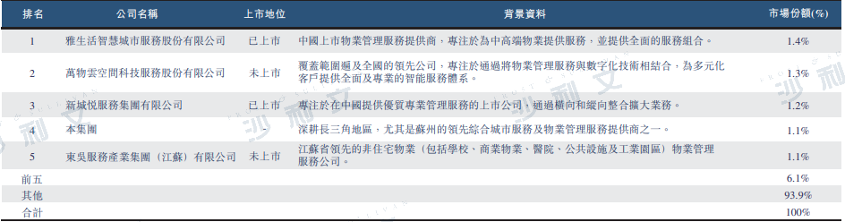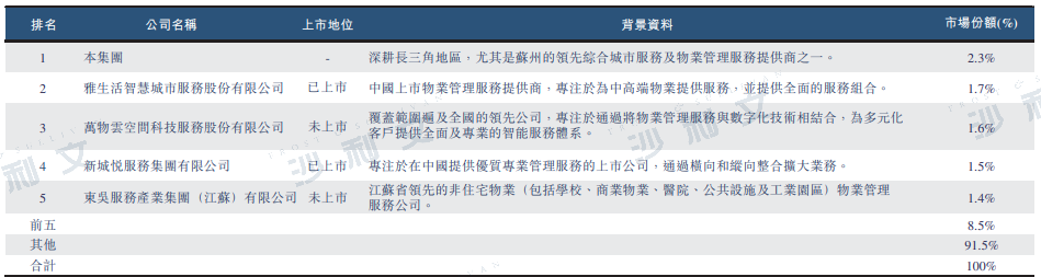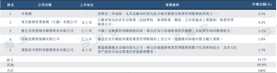 按总收益计,2021年苏州前五大物业管理服务提供商约占苏州物业管理服务公司总收益的8.5%。苏新服务排名第一,约占苏州物业管理服务公司总收益的2.3%。