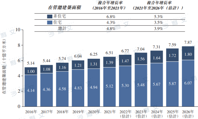 在长三角地区,物业管理公司总在管建筑面积从2016年的51.4亿平方米增至2021年的65.1亿平方米,复合年增长率为4.8%。2026年,总在管建筑面积预期将达到78.7亿平方米,2021年至2026年期间的复合年增长率为3.9%。2021年,非住宅物业总在管建筑面积达到13.9亿平方米,2016年至2021年期间的复合年增长率为6.8%。2026年,非住宅物业总在管建筑面积预计将达到18.0亿平方米,2021年至2026年期间的复合年增长率为 5.3%。