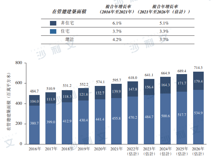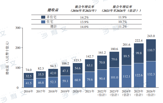 2016年至2021年,长三角地区物业管理公司总收益从人民币740亿元增至人民币1,427亿元,复合年增长率为14.0%。2026年,长三角地区物业管理公司总收益预计将达到人民币2,430亿元,2021年至2026年期间的复合年增长率为11.2%。2016年至2021年,长三角地区提供非住宅物业管理服务的总收益从人民币325亿元增至人民币631亿元,复合年增长率为14.2%。2026年,提供非住宅物业管理服务的总收益预计将达到人民币 1,107亿元,2021年至2026年期间的复合年增长率为11.9%。