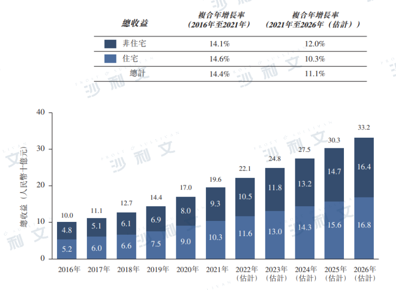 2016年至2021年,苏州市物业管理公司总收益从人民币100亿元增加至人民币196亿元,复合年增长率为14.4%。2026年,苏州市物业管理公司总收益预计将达到人民币332亿元,2021年至2026年期间的复合年增长率为11.1%。2016年至2021年,提供非住宅物业管理服务的总收益从人民币48亿元增加至人民币93亿元,复合年增长率为14.1%。2026年,提供非住宅物业管理服务的总收益预计将达到人民币164亿元,2021年至2026年期间的复合年增长率为12.0%。