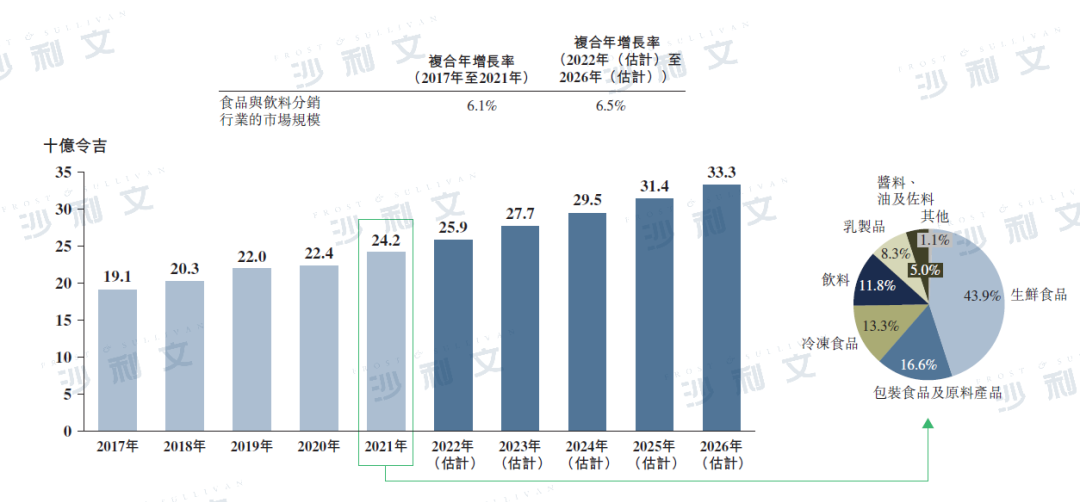 食品与饮料分销指食品与饮料分销商提供的综合服务组合以向有关公司提供渠道及专业知识来发展其业务,包括传统仓储、物流、运输(带冷链)及交付服务,且亦包括整个产业链中的一系列定制化增值业务发展服务(例如市场分析及研究、营销及销售以及售后服务)。食品与饮料分销商支持食品及饮料通过当地渠道及网络由上游食品与饮料供货商移至下游食品与饮料客户。