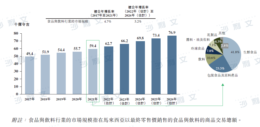 马来西亚食品与饮料行业的市场规模由2017年的约494亿令吉增至2021年的约594亿令吉,复合年增长率约为4.7%。生鲜食品为食品与饮料行业的最大部分,于2021年占比约为41.8%,其次是包装食品及原料产品(约23.5%)、饮料(约10.6%)、冷冻食品(约7.8%)、酱料、油及佐料(约7.1%)、乳制品(约6.3%)以及其他各分部(约2.8%)。