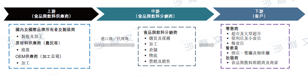 食品与饮料分销行业上游包括第三方及其他食品与饮料产品供货商(包括国内及国际品牌所有者及制造商)、自有食品与饮料产品OEM供货商以及原材料供货商。进口商及当地代理商亦可能在连接马来西亚食品与饮料供货商与食品与饮料分销商的产业链中发挥作用。食品与饮料分销行业的下游参与者包括不同渠道的零售商、餐饮业及批发商。处于中游的食品与饮料分销商在产业链中为上游供货商及下游客户提供食品与饮料分销服务。