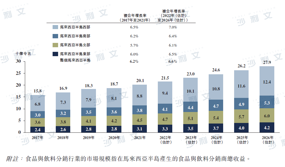 因此,在马来西亚半岛西部较快的经济发展的推动下,马来西亚半岛西部食品与饮料分销市场从2017年的约68亿令吉增至2021年的约88亿令吉,复合年增长率约为6.5%,高于马来西亚半岛南部(约6.2%)、马来西亚半岛北部(约5.7%)及马来西亚半岛东部(约6.0%),且马来西亚半岛西部食品与饮料分销行业在整个马来西亚半岛的比重亦从2017年的约43.0%增至2021年的约43.6%。