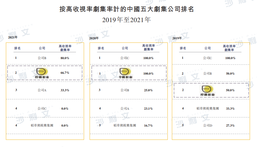 根据沙利文报告,按高收视率剧集率计,柠萌影业自2019年至2021年于中国稳定保持前三名的排名。