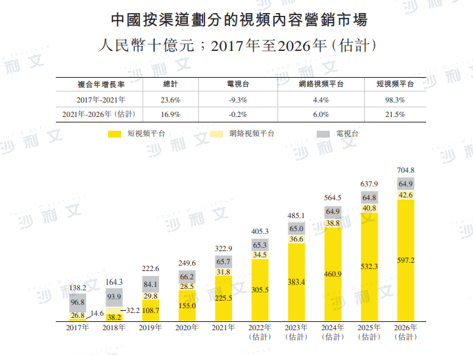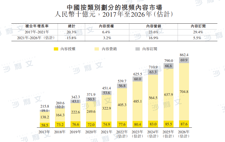 根据沙利文报告,于2017年至2021年,中国视频内容市场增长迅速,市场规模由人民币2,158亿元增长至人民币4,514亿元,复合年增长率为20.3%。受需求增长的推动,预期视频内容的总市场规模到2026年将达到人民币8,624亿元,于2021至2026年,复合年增长率为13.8%。