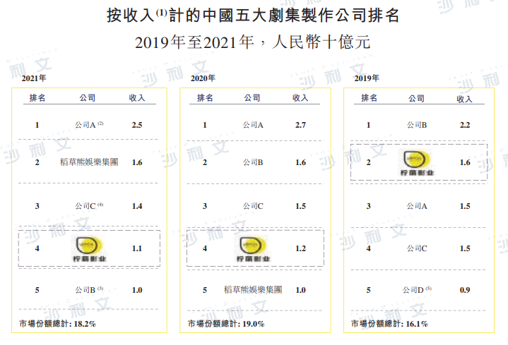 根据沙利文报告,于2021年,按授权收入计,前五大剧集制作公司的总市场份额占整个剧集市场的18.2%。自2019年至2021年,按收入计,柠萌影业于中国均稳居前五名。