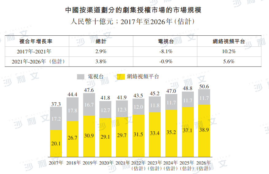 根据沙利文报告,于2021年,中国剧集授权市场的规模为人民币419亿元,从2017年至2021年复合年增长率为2.9%,并预期到2026年将达至人民币506亿元,从2021年至2026年复合年增长率预期为3.8%。