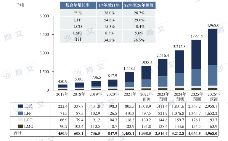 得益于锂离子电池下游应用的增长,全球锂离子电池正极材料市场快速增长,出货量由2017年的450.9千吨增长至2021年的1,458.1千吨,同期年复合增长率为34.1%。随着全球电动汽车、消费电子产品和储能市场的持续增长,预计2022年至2026年全球锂离子电池正极材料市场出货量将以26.5%的年复合增长率保持增长,并于2026年达到4,968.0千吨。