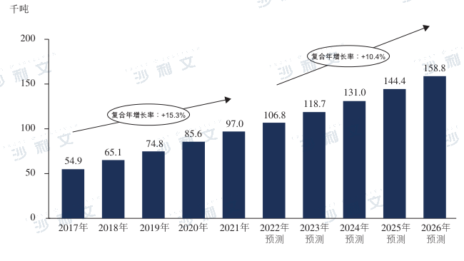 三元前驱体是生产三元锂离子电池的重要组成部分。三元锂离子电池主要用于电动汽车、储能系统及消费电子产品等下游应用。从下游需求来看,电动汽车动力电池是三元前驱体的主要下游应用,发展潜力巨大。由于全球电动汽车市场的快速增长及电动汽车渗透率的不断提高,对于三元前驱体材料的需求进一步提升。预计2022年至2026年全球三元前驱体出货量将以28.7%的年复合增长率于2026年达至2,803.0千吨,与全球电动汽车市场高速增长保持一致。