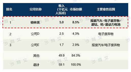 按收入规模计,2021年,中国城市矿山开采业特定领域总市场规模为人民币591.4亿元,市场高度分散,前三名公司营业总收入占市场份额的15.7%。格林美是该领域最大的参与者,年收入为人民币50.0亿元,市场份额为8.5%。