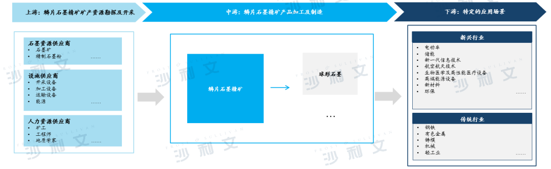 鳞片石墨精矿行业的上游主要包括石墨资源供货商,包括石墨矿和精制石墨粉供货商、采矿设备、加工设备等设施供货商、运输设备供货商和能源供货商,以及人力资源供货商。鳞片石墨精矿在经过矿石开采和初级加工后出售予中游石墨产品制造商,进一步加工制成材料级石墨产品。鳞片石墨精矿也可由矿山拥有人销售至石墨分销商,再进一步销售至石墨制造商。中游制造商对于石墨进行进一步的加工处理。鳞片石墨精矿行业的下游是各种石墨产品的广阔应用领域。