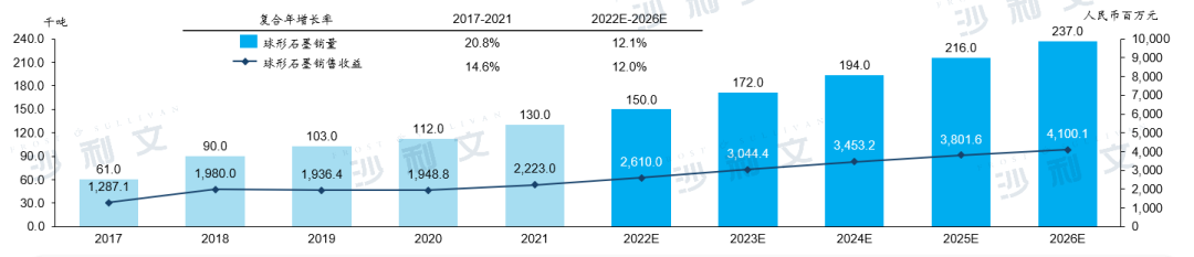中国球形石墨销量及销售收益,2017-2026E