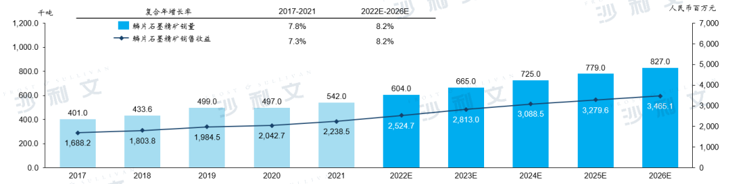 目前,由于化学及物理性质独特,石墨被其他矿产取代的可能性较低。鳞片石墨精矿非常适合多种工业和科技应用。鳞片石墨精矿的主要应用包括电池、耐火材料、铸造、润滑油等等。电池板块预期将为预测期间增长最快的应用领域之一。由于新能源汽车和储能系统的应用增多,预计中国锂离子电池市场会快速增长。因此,鳞片石墨精矿需求将进一步上升。自2017年以来,中国鳞片石墨精矿的销量及收益均稳步增长。于2021年,鳞片石墨精矿的销量及收益分别为542.0千吨及人民币2,238.5百万元。