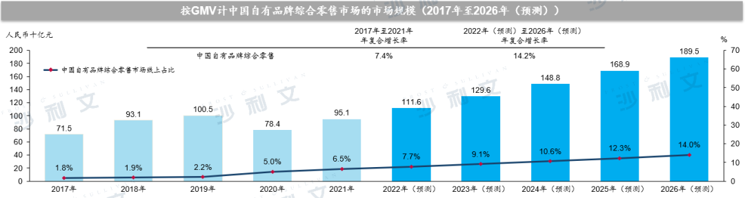 按GMV计,中国自有品牌综合零售市场的规模由2017年的人民币715亿元增至2021年的人民币951亿元,年复合增长率为7.4%,且预计2022年至2026年期间将以14.2%的年复合增长率进一步增加。下图展示在所列年度,按GMV计中国自有品牌综合零售市场的规模: