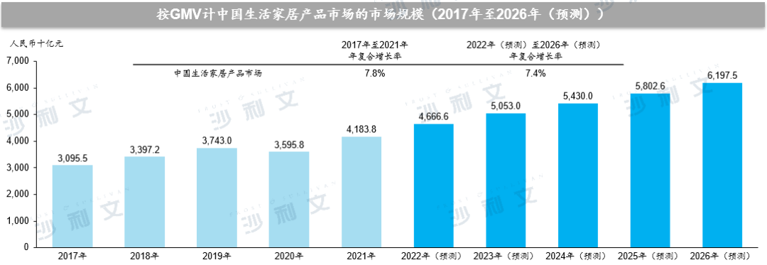 生活家居产品一般指各种消费性家居用品,例如个人护理产品、包包和配饰、小型电子产品、数码配件、文具、零食、日常用品、纺织品和玩具等。按GMV计,中国生活家居产品市场的规模由2017年的人民币3.1万亿元增至2021年的人民币4.2万亿元,年复合增长率为7.8%,超过同期中国零售市场4.8%的年复合增长率,且为所有零售分部中增长最快的市场之一。下图展示在所列年度,按GMV计中国生活家居产品市场的规模: