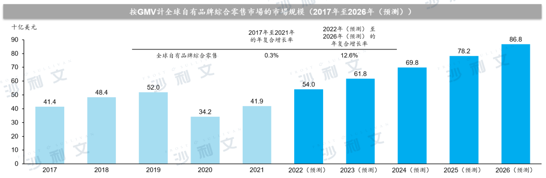 在过去20年内,全球自有品牌综合零售市场稳定增长。按GMV计,全球自有品牌综合零售市场的规模由2017年的414亿美元增至2021年的419亿美元,年复合增长率为0.3%,且预计2022年至2026年期间将以12.6%的加速年复合增长率持续增长。下图展示在所列年度,按GMV计全球自有品牌综合零售市场的规模: