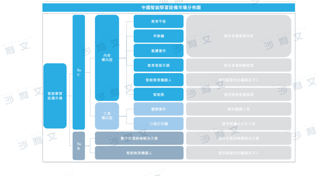 中国的智能学习设备服务市场旨在为不同阶段的学生(包括幼儿园、中小学以及高中的学生)提供教育服务的硬件设备市场,通过应用智能技术向学生及其家长/教师提供更友好的教育体验。从应用场景的角度来看,整体市场可以分为两大类,一类是主要服务于个人终端用户的To C学习市场,另一类为To B学习市场。