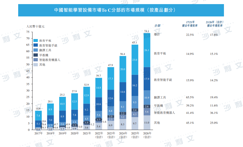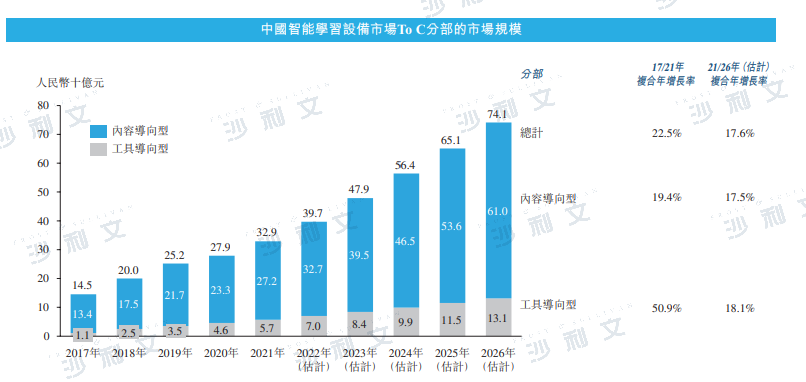 从市场规模上来看,2021年中国智能学习设备服务市场达到659亿元人民币,从2017年的281亿元人民币增长至2021年复合增长率达23.7%。其中,2021年To C学习市场规模达329亿元人民币,鉴于辅助教育有庞大且持续的需求,To C学习市场将持续迎来进一步的稳健增长。预计到2026年,中国智能学习设备市场规模增长至1,450亿元,2021年至2026年的年复合增长率为17.1%,其中To C学习市场将增长至741亿元,2021年至2026年的年复合增长率为17.6%,略高于整体智能学习设备市场。