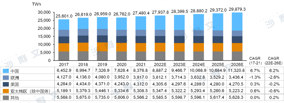 中国是全球最大、增长最快的电力市场。2021年,中国总发电量为8,376.8TWh,占全球总发电量的30.5%。中国的发电量也从2017年的6,452.9TWh增加到2021年的8,376.8TWh,复合年增长率为6.7%,预计将从2022年的8,887.2TWh增加到2026年的11,320.8TWh,复合年增长率为6.2%。