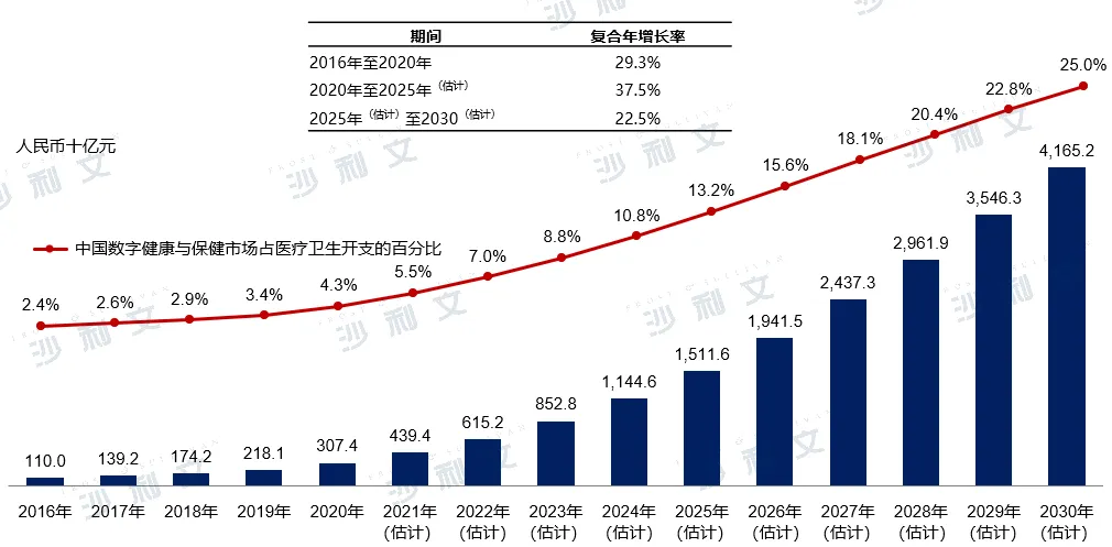 在有利的政策和持续的技术进步的推动下,医疗卫生行业的不同部门都有明显的加速数字化趋势,这导致了中国数字化健康和保健市场的快速增长。预计2025年中国整个数字化健康和保健市场的规模将达到人民币15,116亿元,从2020年到2025年的年复合增长率为37.5%,并在2030年进一步达到人民币41,652亿元,从2025年到2030年的年复合增长率为22.5%。