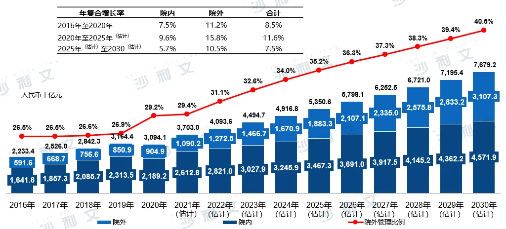 处方药外流是慢病管理的一个重要的新兴趋势,受这一长期趋势驱动,在线下药店数字化及互联网医院涌现的支持下,慢病管理的院外市场有望继续快于市场增长。中国院外慢病管理市场(包括销售医疗器械、耗材、药品及提供管理服务)的市场规模将从2020年的人民币9,049亿元增加到2025年的人民币18,833亿元,预计于2030年将达到人民币31,073亿元,从2020年到2025年的复合增长率为15.8%,从2025年到2030年的复合增长率为10.5%。